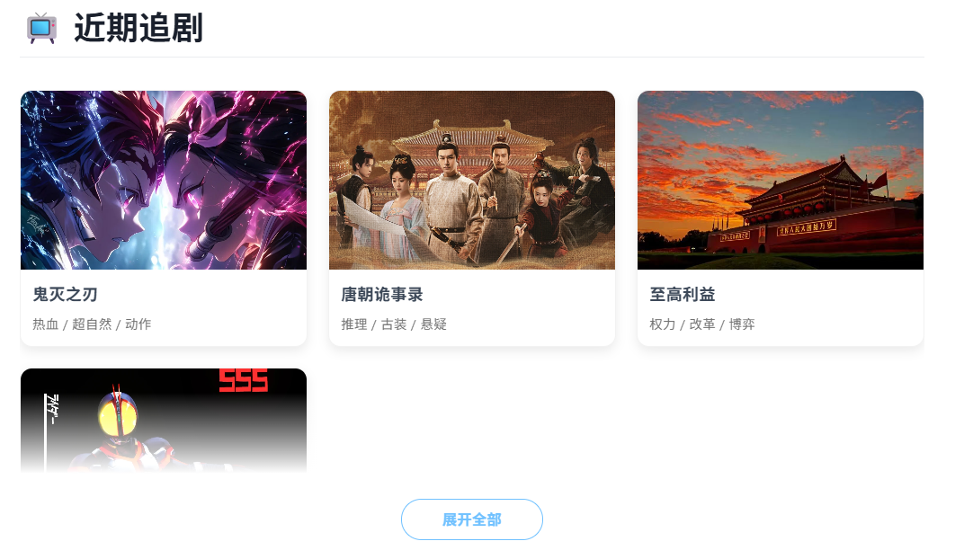 | <div class="recom-wrapper"> <div class="recom-container collapsed" id="recomGrid"> <a href="https://kimetsu.com/" class="recom-card"> <img src="/img/about_img/demon.jpg" class="recom-img" alt="鬼灭之刃"> <div class="recom-info"> <span class="recom-title">鬼灭之刃</span> <div class="recom-tags">热血 / 超自然 / 动作</div> </div> </a> <a href="https://movie.douban.com/subject/35235151" class="recom-card"> <img src="/img/about_img/tanggui1.png" class="recom-img" alt="长安诡事录"> <div class="recom-info"> <span class="recom-title">唐朝诡事录</span> <div class="recom-tags">推理 / 古装 / 悬疑</div> </div> </a> <a href="https://movie.douban.com/subject/4812778" class="recom-card"> <img src="/img/about_img/zhigaoliyi.jpg" class="recom-img" alt="至高利益"> <div class="recom-info"> <span class="recom-title">至高利益</span> <div class="recom-tags">权力 / 改革 / 博弈</div> </div> </a> <a href="https://movie.douban.com/subject/3291471" class="recom-card"> <img src="/img/about_img/555.jpg" class="recom-img" alt="Faiz"> <div class="recom-info"> <span class="recom-title">假面骑士Faiz</span> <div class="recom-tags">科幻 / 动作 / 特摄</div> </div> </a> </div> <div class="recom-toggle-btn" id="toggleBtn">展开全部</div> </div>